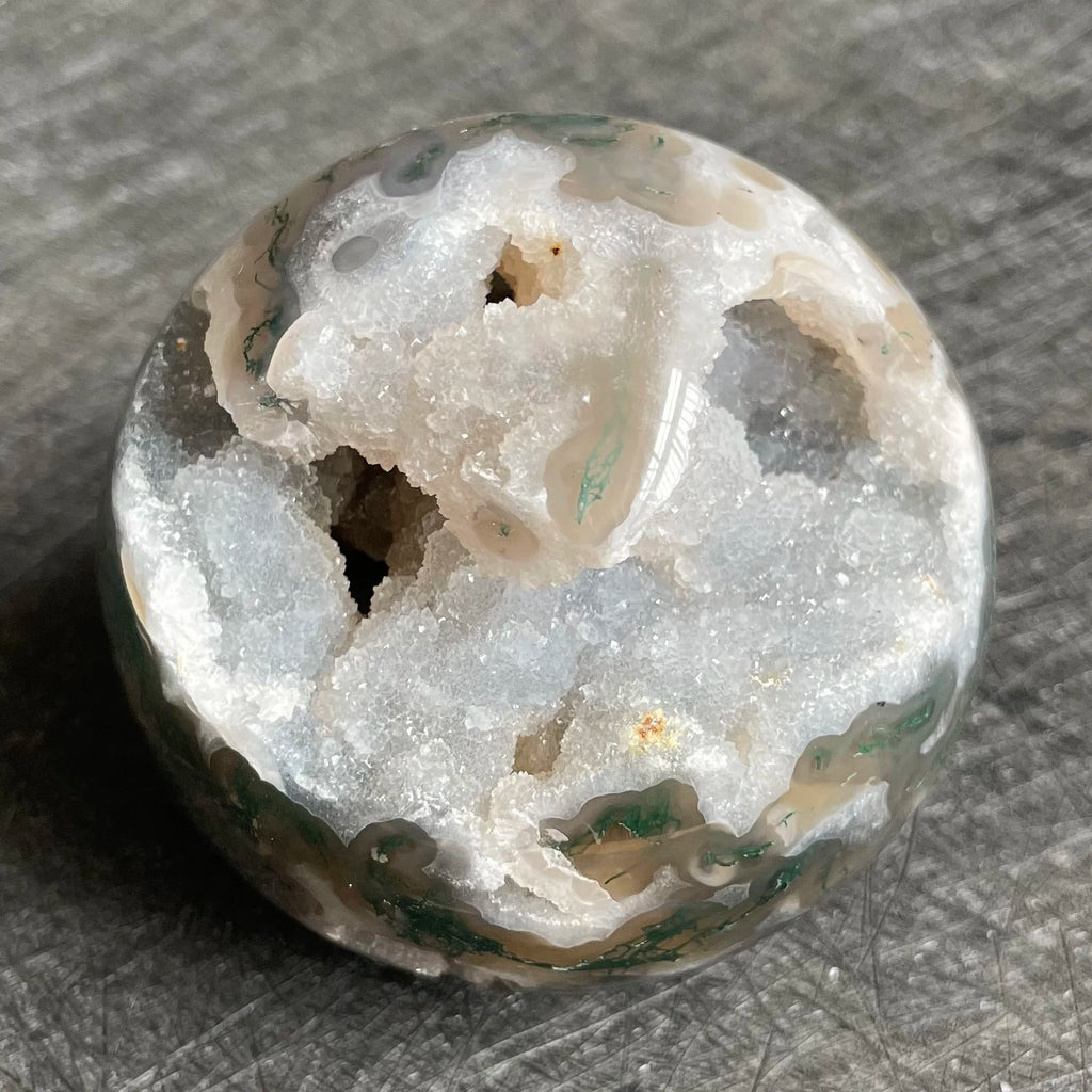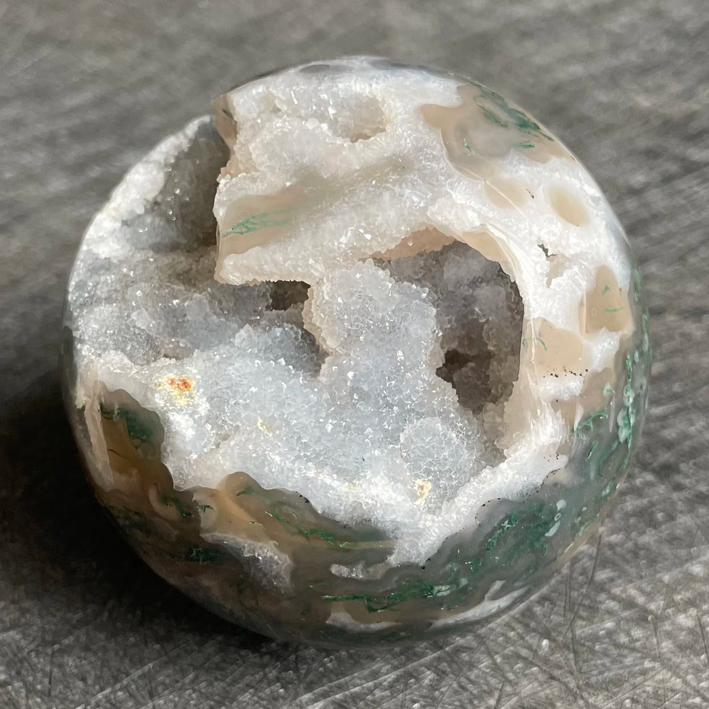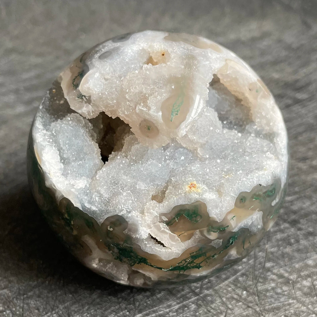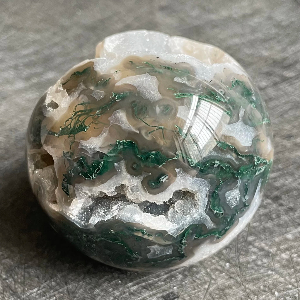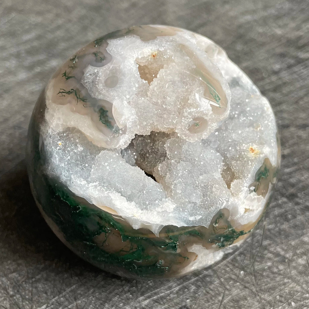 • Material: Moss Agate Geode Ball